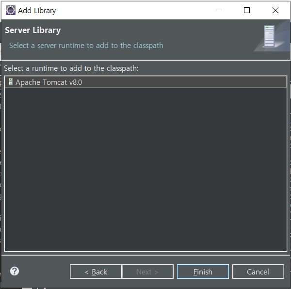 Server Runtime 선택 후 Apache Tomcat v8.0 을 선택해줍니다.
