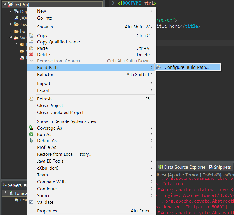 해당 프로젝트 > Build Path > Configure Build Path 를 눌러줍니다.