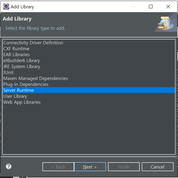 Librarise 탭에서 Add Libray 를 선택 후 서버를 추가해야 합니다.